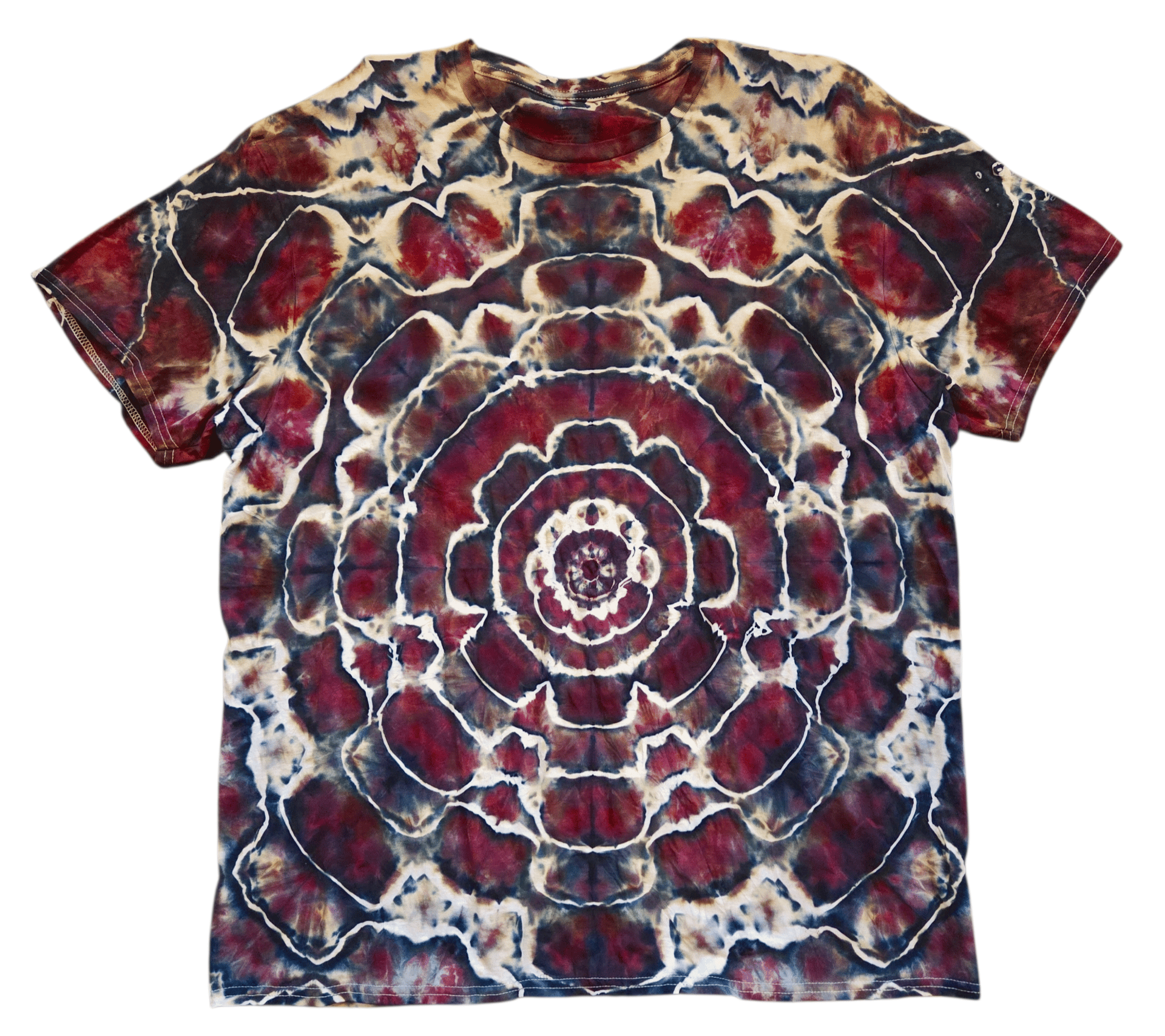 Mandala Ron Star Tie-Dye. Featuring deep amethyst and crimson tones woven into a mesmerizing geometric bloom, each shirt is a wearable piece of art.