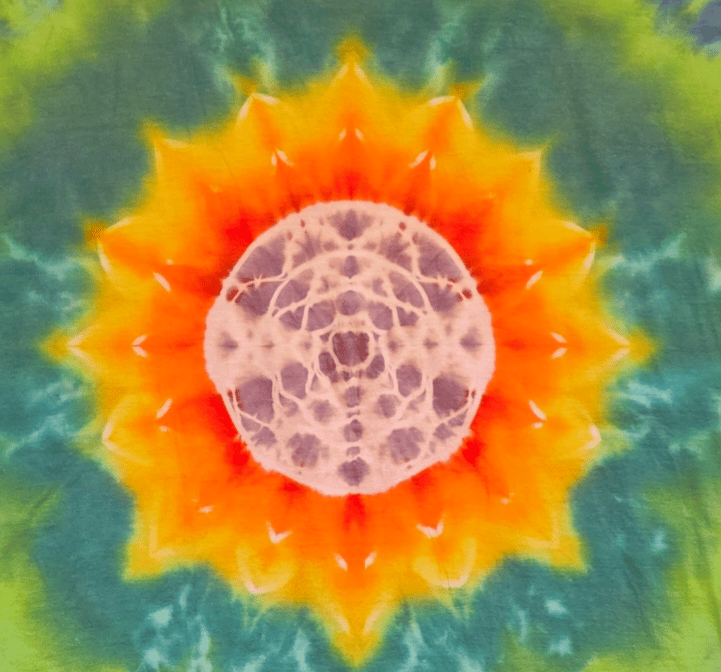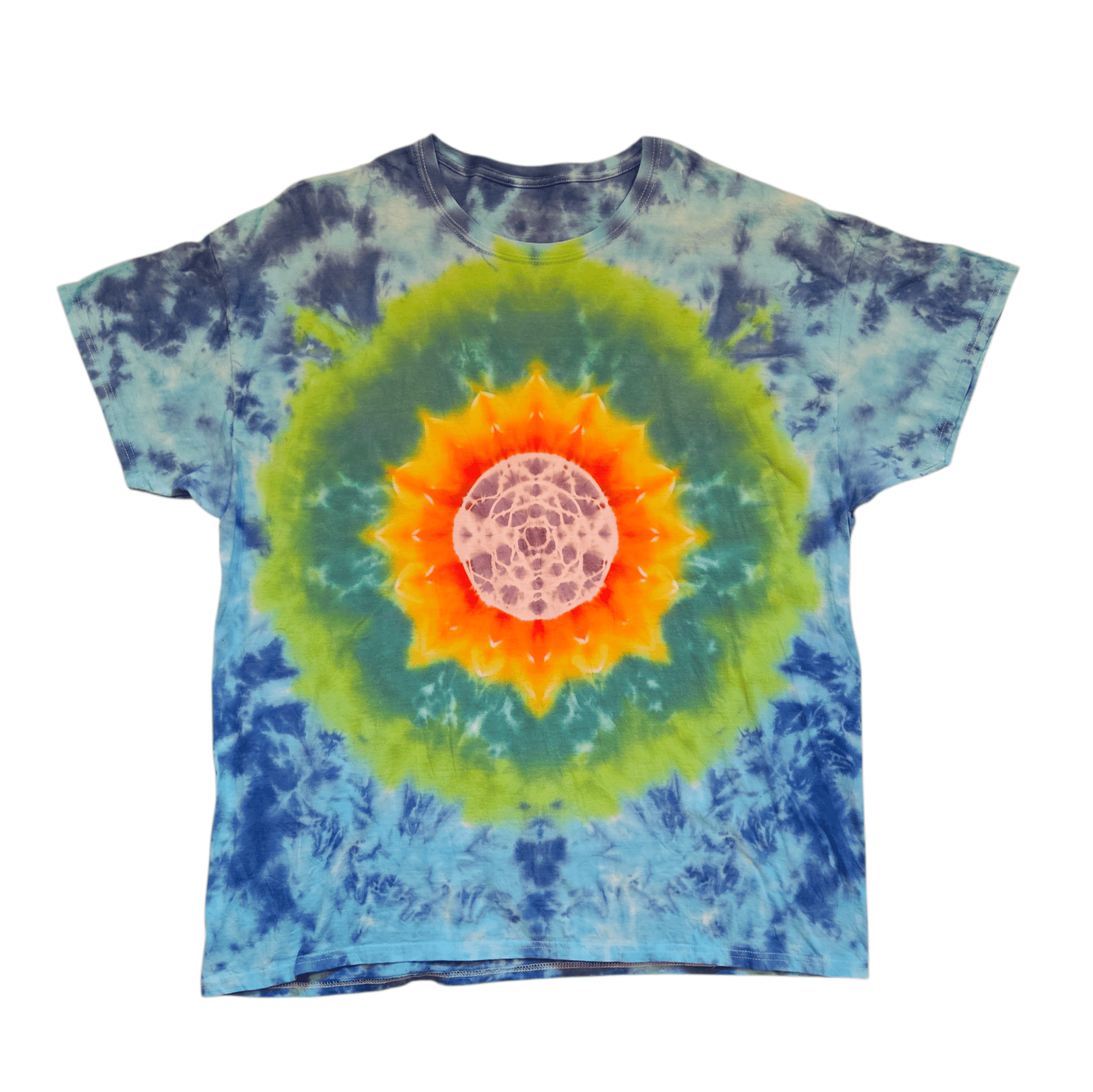 The Technique: Hand-tied mandala core with a "scrunch" dyed sky.