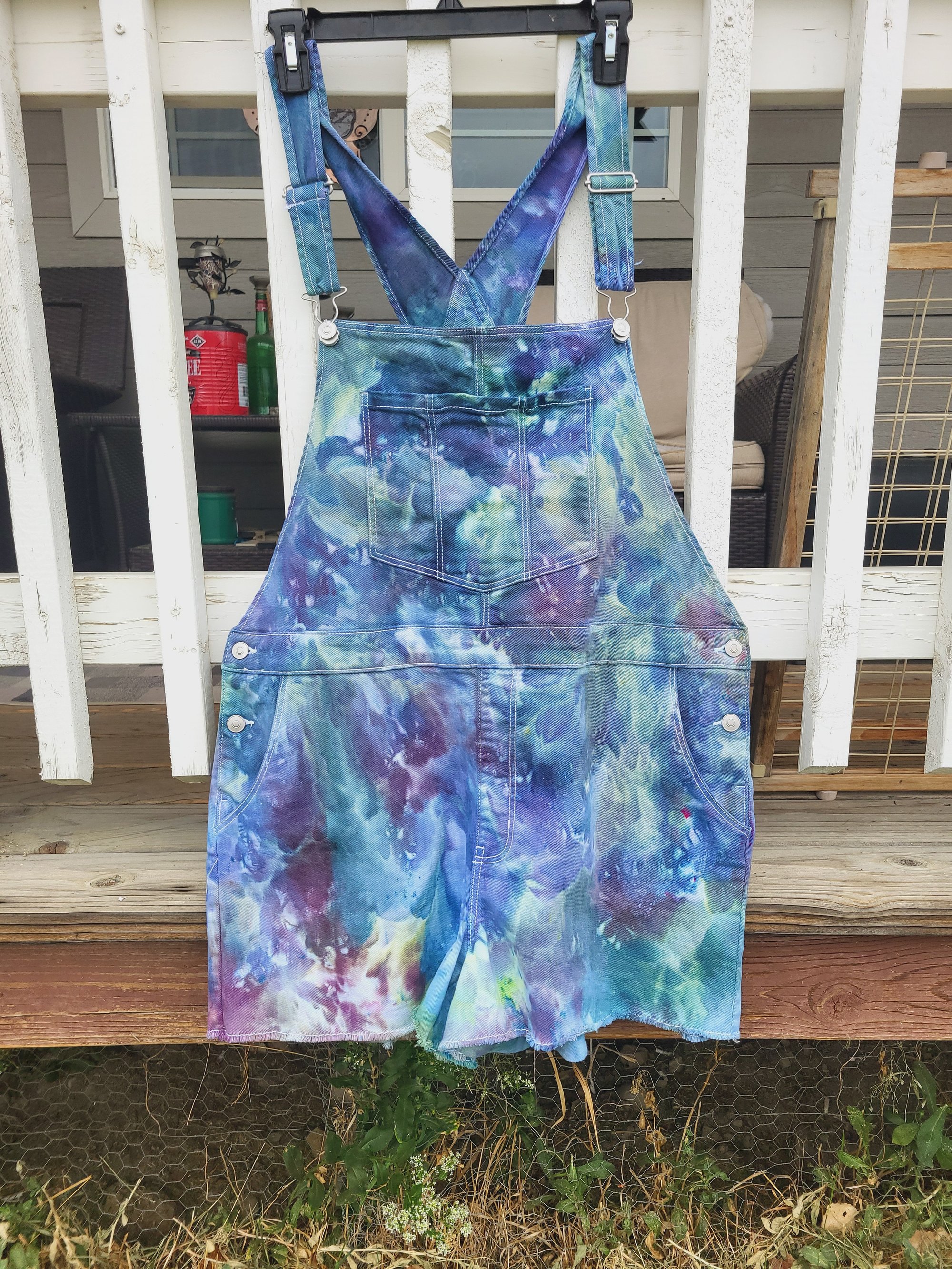 Make a splash in these ice dyed cotton shortalls β a wearable galaxy of blues, purples, and emerald green! Hand-dyed with love and frozen magic, each piece is completely unique.