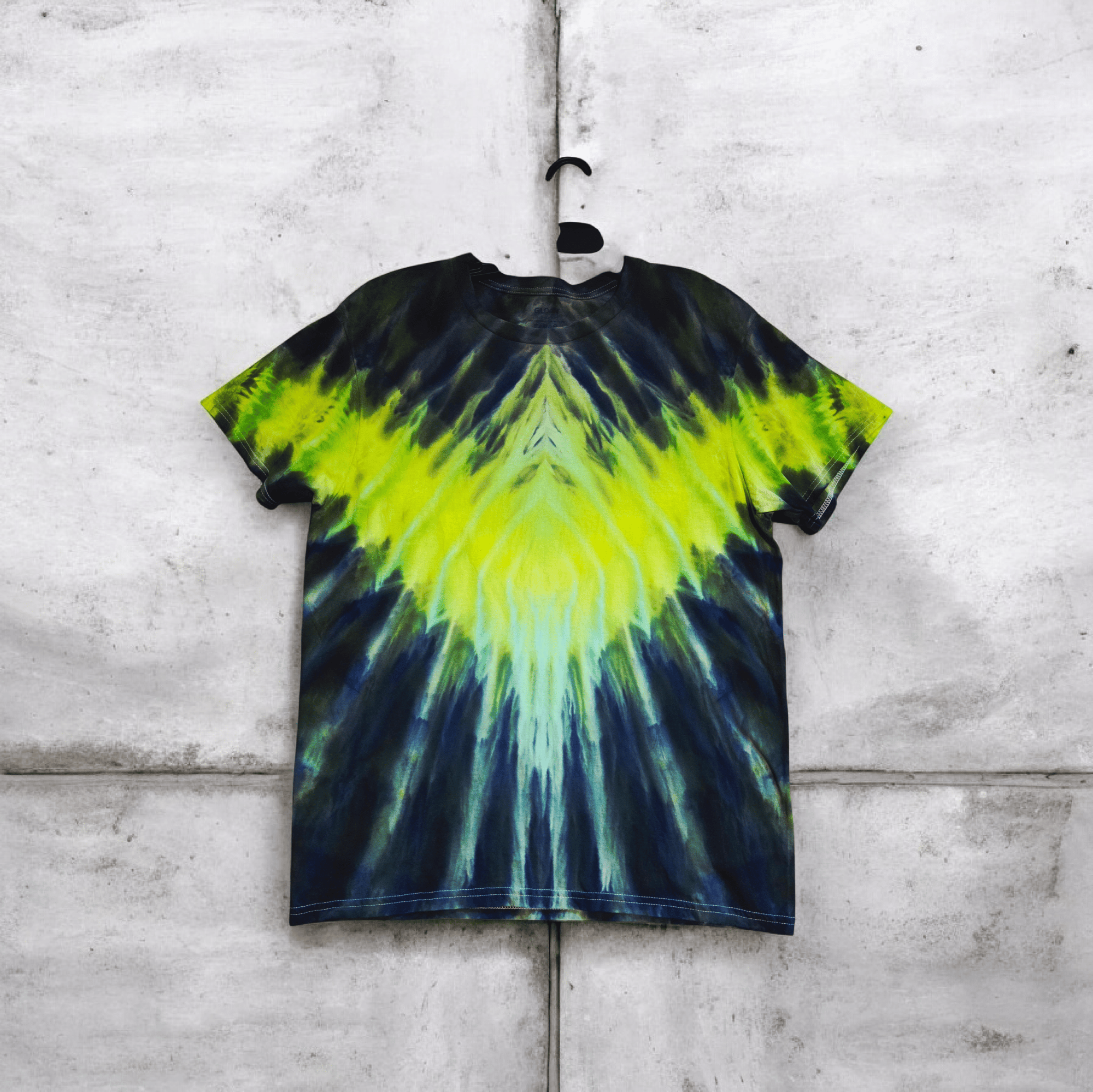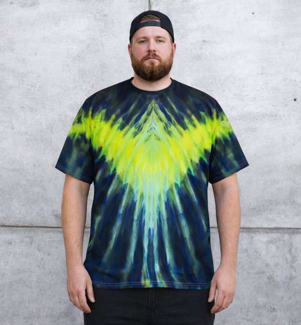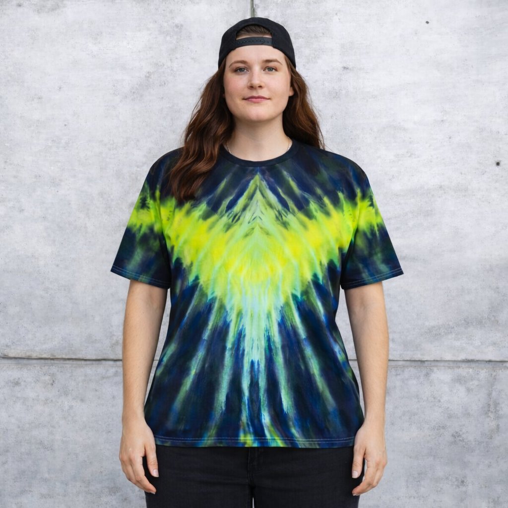 Bold, vibrant, and uniquely handcrafted — this ice-dye tie-dye tee features a stunning burst of neon yellow and greens blending into deep navy for a dramatic, eye-catching look. Soft, breathable, and comfortable for everyday wear, festivals, or standing out in style.