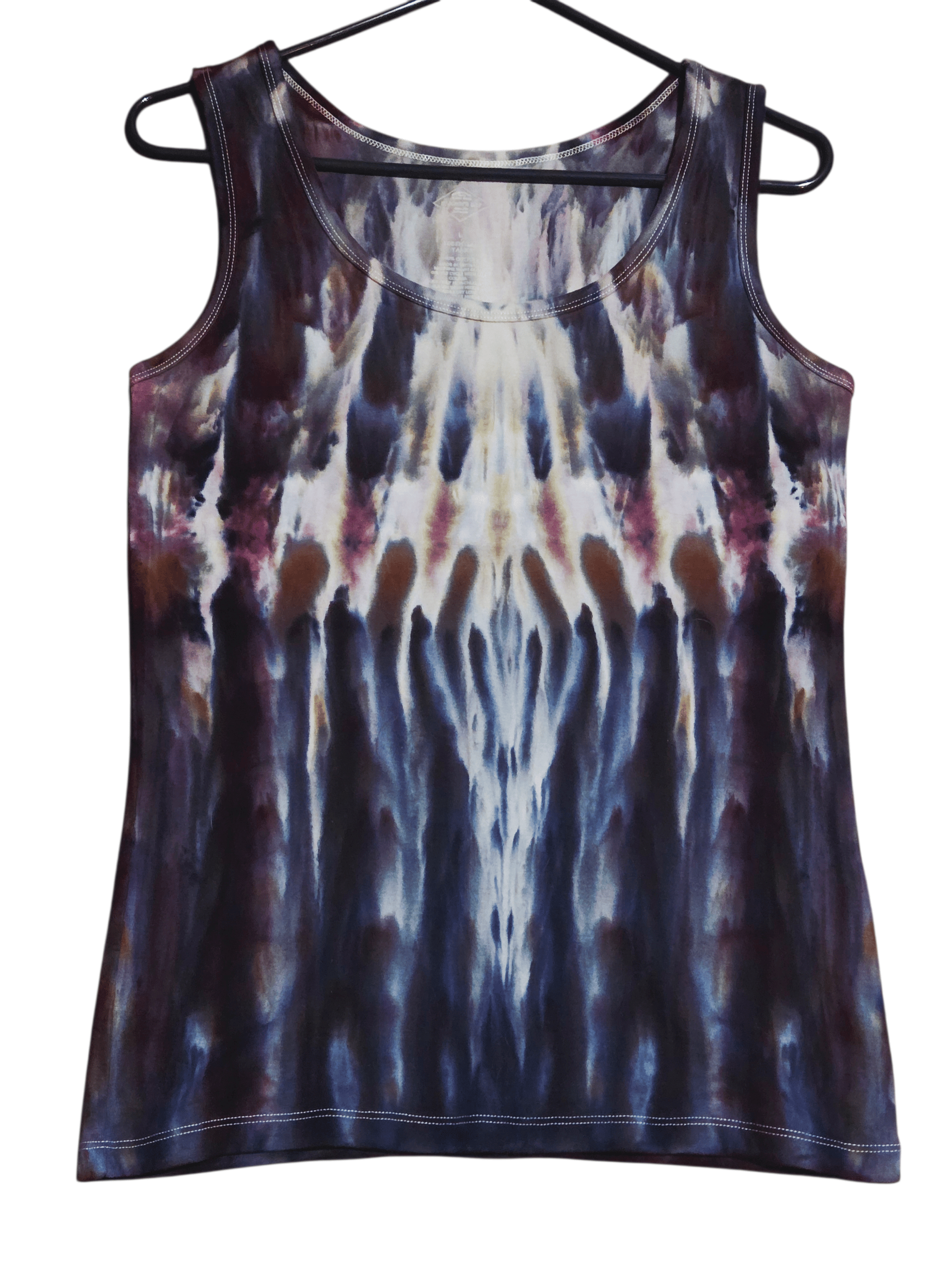 Featuring a stunning, hand-dyed symmetrical pattern, this ribbed tank blends earthy indigos and deep plums with crisp white highlights. The vertical "flow" of the design perfectly complements the flattering ribbed texture, creating a silhouette that's as bold as it is comfortable.