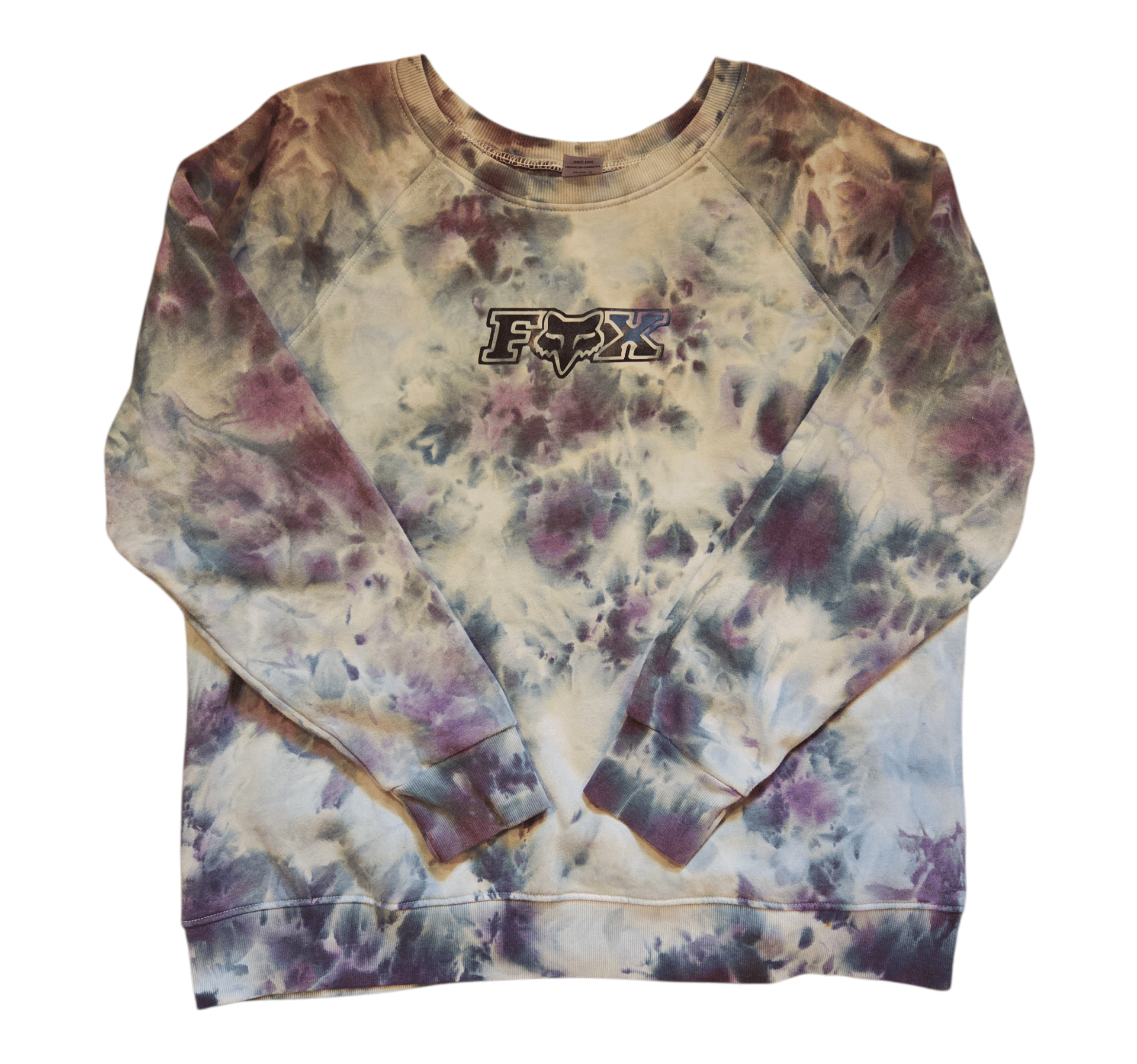 Level up your loungewear with this one-of-a-kind Fox Racing Ice Dye Sweatshirt. Featuring a soft, ethereal blend of moody purples and forest greens, this piece brings a dreamy, high-end vibe to classic motocross culture.