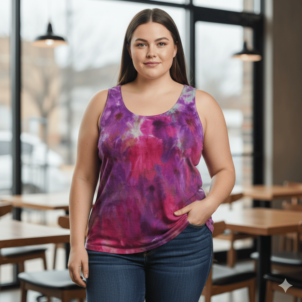 Gorgeous ice-dyed tie-dye tank top, featuring rich blends of purples, pinks, and berry tones that melt together in a dreamy watercolor effect. Soft, breathable, and flattering, this tank offers a comfortable fit perfect for everyday wear